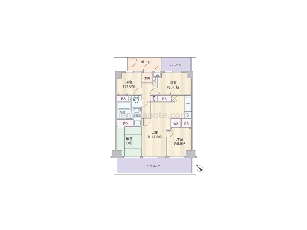 専有面積81.00平米の4LDK。約8mのワイドスパンのプランで、リビング・ダイニングを含む3室がバルコニー面しています。南西と北東の両面にバルコニー、玄関前にポーチ付き。直接共用廊下に面する居室がなく、プライバシーが確保され、開放感があります。
