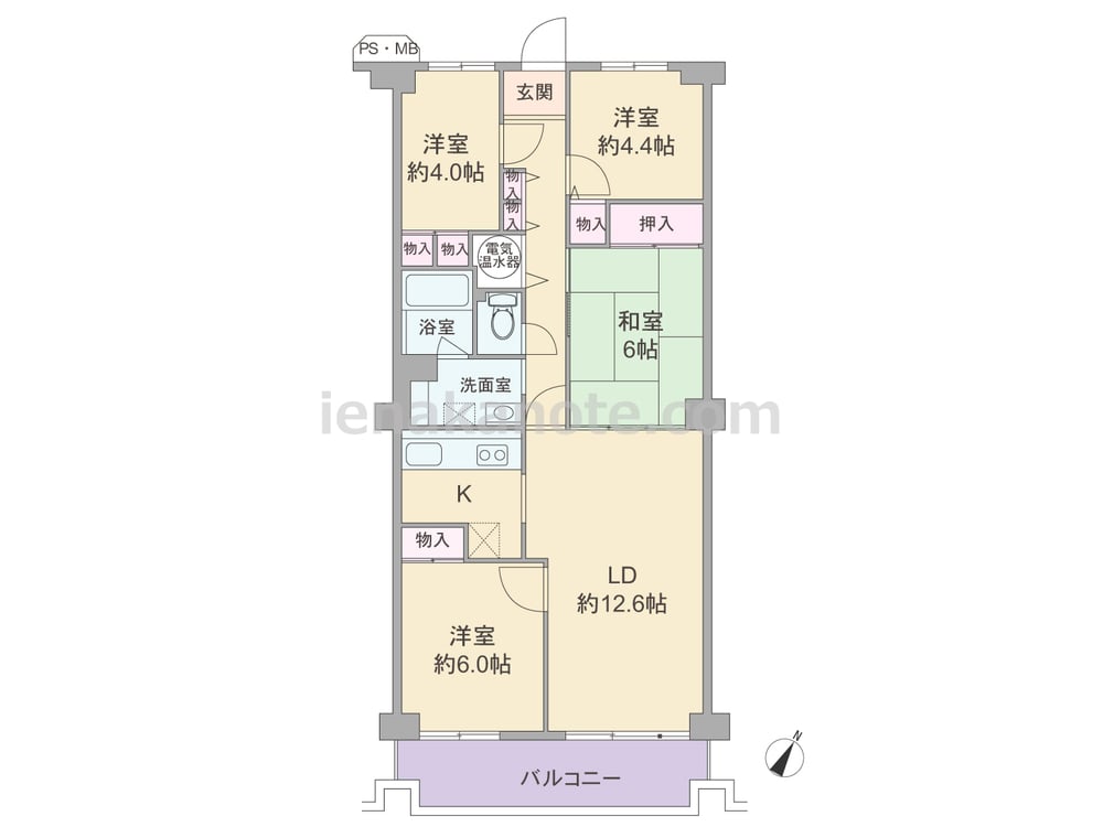 専有面積81.90平米の4LDK。キッチンは独立型。リビング・ダイニングと和室が続き間で、一つの空間としても使用可能。和室は2カ所に扉があり、客間としても使いやすくなっています。各居室の他、廊下に面して物入付きです。