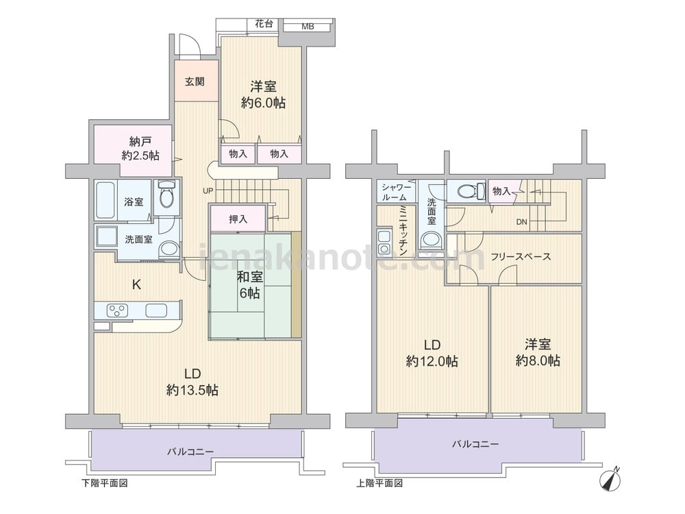 専有面積140.34平米の4LDK。メゾネットタイプの二世帯対応プラン。1階のキッチンはカウンタータイプで家事をしながら家族とコミュニケーションが取りやすく、キッチンから洗面室へアクセス可能な家事効率の良い配置。リビングダイニングに隣接する和室の襖を開放すれば、約19.5帖大の空間としても使えます。納戸は季節の物や日用品のストック、防災グッズなどを保管するのに便利。2階はミニキッチンとシャワールームがあり、収納スペースは廊下部分にあります。フリースペースは書斎やPCコーナーなどに利用出来そう。上下階にバルコニーが設けられています。
