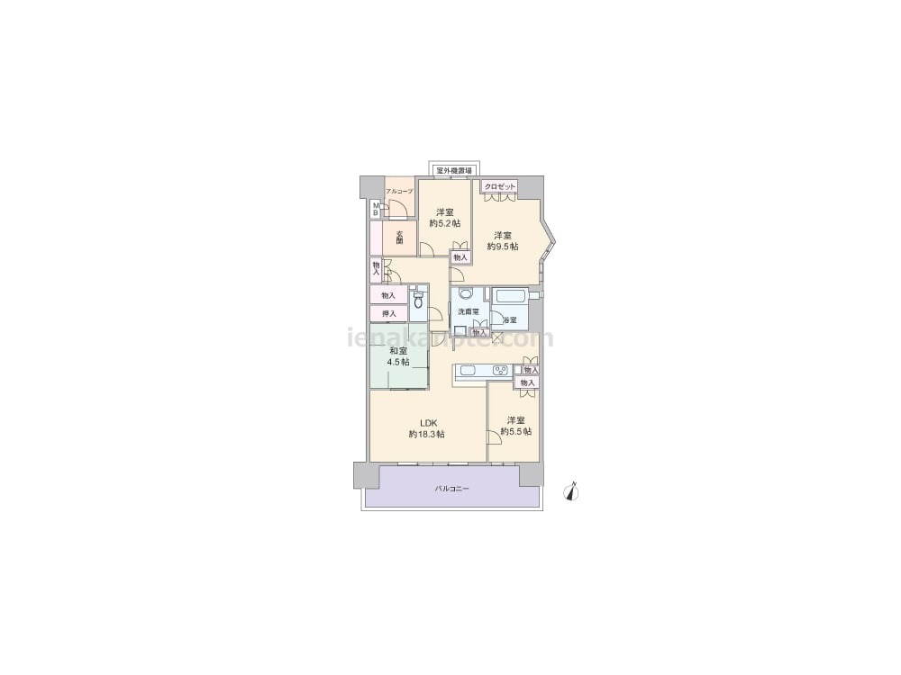 専有面積99.49平米の4LDK。玄関前にアルコーブがあり、玄関から居室を見通せない、プライバシーに配慮されたプラン。LDKは約18.3帖大とゆとりがあり、和室4.5帖の襖を開放すれば約22.8帖大の空間としても使えます。キッチンはセミオープンタイプ。居室以外にも室内廊下やキッチン・洗面室にも収納スペースが設けられています。浴室にも窓があり、換気がしやすく快適。バルコニーは約15.72平米大と広く、テーブルセットを置いたり、ガーデニングを楽しむのによさそうです。