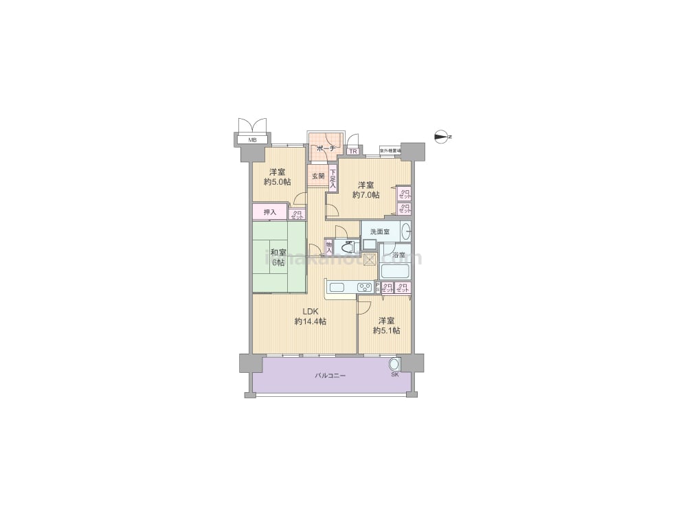 専有面積80.86平米の4LDK。玄関前に専用ポーチとトランクルーム付き。LDKは約14.4帖、キッチンは家事をしながら家族と会話を楽しめる対面カウンタータイプ。和室の襖を開放すれば、約20.4帖大の空間としても利用可能。洋室約5.1帖はLDKを通って行き来するため、子供部屋に使用すればコミュニケーションの機会が増えます。各居室と室内廊下に収納スペースがありますが、洋室約5.0帖のクロゼットは容量が少ないため、必要に応じて収納家具を置くなどの工夫が必要です。バルコニーは約15.20平米の広さとスロップシンクが設けられ、ガーデニングをゆったりと楽しむ事が出来ます。