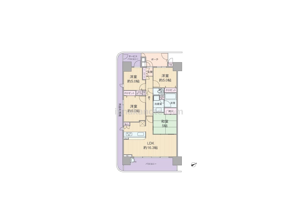 専有面積79.76平米の4LDK。玄関前に専用ポーチがあり、居室の窓が共用廊下に直接面していない、プライバシー重視のプラン。LDK約16.3帖には和室5帖が隣接しており、襖を開放すれば約21.3帖大の空間としても使用可能。キッチンは料理中も家族と会話を楽しめる対面カウンタータイプです。収納スペースが各所にあり、共用廊下に面してトランクルームもあります。スロップシンク付きのバルコニーは約18.28平米と広く、ガーデニングなどもたっぷり楽しめそうです。