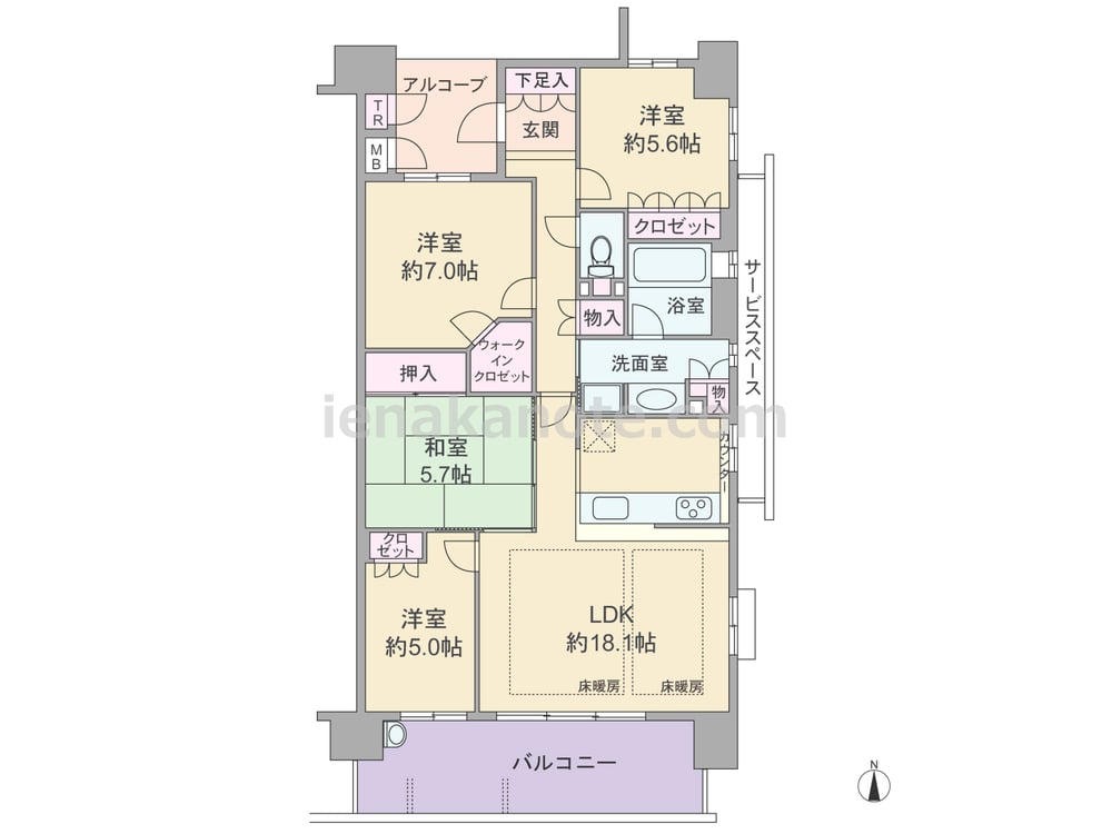 専有面積93.06平米の4LDK。玄関前にプライバシーに配慮されたポーチがあり、ポーチ内に便利なトランクルーム付き。キッチンは対面カウンタータイプで、窓があります。リビング・ダイニングは開放感のある二面採光。主寝室は約7帖の広さがあり、ウォークインクロゼット付き。浴室と洗面室にも窓があり、換気がよく快適。バルコニーは出幅があります。
