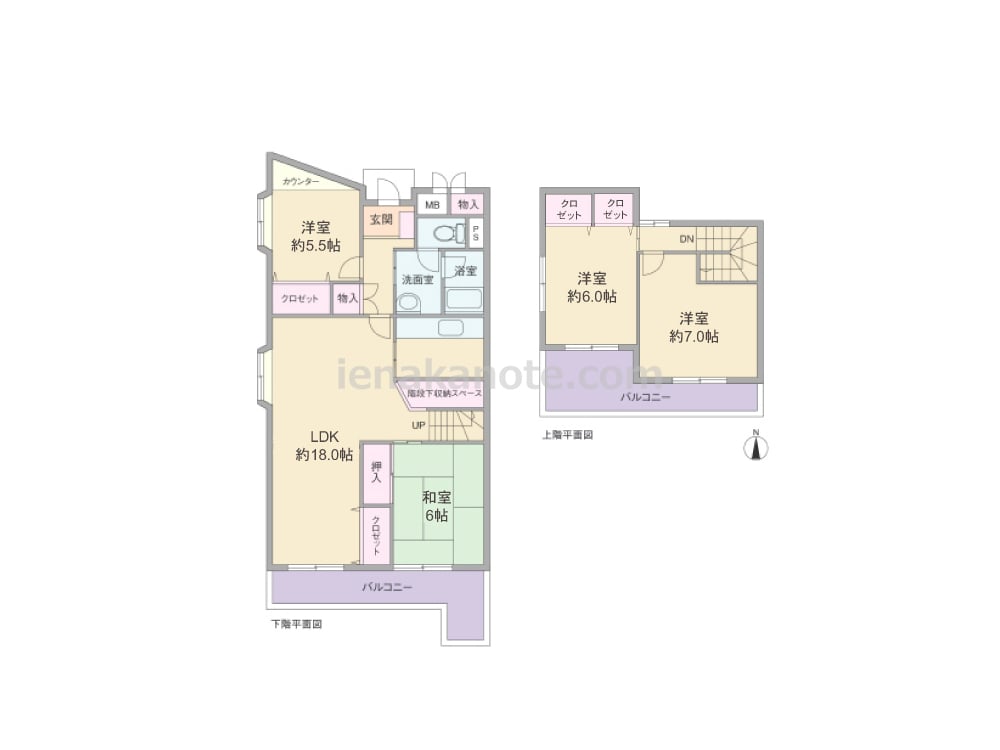 専有面積94.87平米の4LDK、メゾネットタイプ。LDKは約18.0帖の広さがあり、独立型のキッチンはリビング・ダイニングに生活感が伝わりにくいのが特徴。主寝室約7.0帖にはクロゼットがありませんが、その他の居室とLDK、玄関ホール、共用廊下に面して収納スペースが設けられています。バルコニーが2カ所あるため、ガーデニングもたっぷり楽しめます。