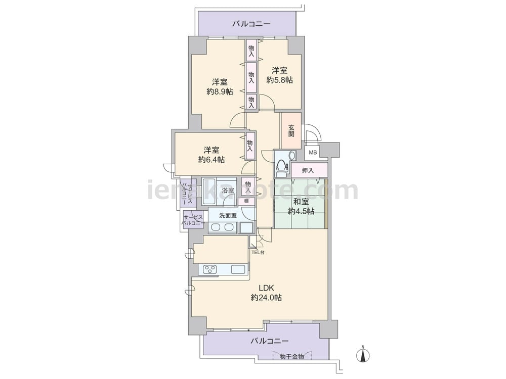 専有面積107.4平米の4LDK。南北両面にバルコニーがある、センターインのプラン。LDKは約24.0帖大と広く、対面カウンタータイプのキッチンは家事をしながら家族と会話を楽しめる配置。LDKにはコーナーサッシ、和室4.5帖にはモダンな琉球風畳が用いられています。トイレ内に手洗いカウンターがあり、ダブルボウルの洗面台は慌しい朝の身支度に便利。浴室の窓は湿気がこもりにくく快適です。各居室と室内廊下に収納スペース付き。バルコニーは約23.16平米と広く、アウトドアリビングやガーデニングを楽しむのにぴったりです。