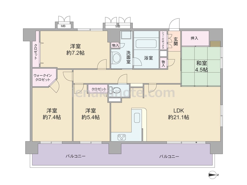 専有面積95.25平米の4LDK。東向き・ワイドスパンのプラン。玄関先から室内が見通せない、プライバシーにも配慮された造りです。LDKは約21.1帖大と広く、L字型・対面カウンタータイプのキッチンは料理中も家族と会話を楽しめます。和室4.5帖は玄関ホールとLDKの2カ所から出入りでき、個室や客間、くつろぎのリビングスペースなど色々な使い方が可能。各居室に収納があり、玄関ホールや洗面室にも物入付きです。バルコニーは約18.3平米とゆとりがあります。