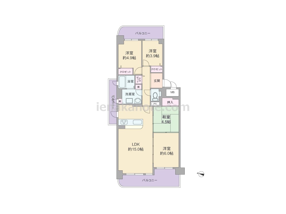 専有面積74.14平米の4LDK。バルコニーが3カ所あるセンターインのプラン。LDK約15.0帖と和室4.5帖、洋室約6.0帖が続き間で、引き戸を開放すれば空間を広々と使う事が出来ます。キッチンは対面カウンタータイプの仕様で、キッチン横にはバルコニーへの勝手口付き。洋室約6.0帖にはクロゼットがありませんが、その他の居室と室内廊下、洗面室に収納が設けられています。洗面室と浴室の窓は湿気がこもりにくく快適です。