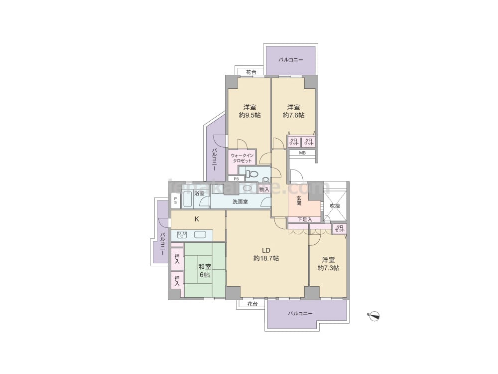 専有面積121.42平米の4LDK。共用廊下に居室の窓が面していない、プライバシーが確保されたプラン。全部屋6帖以上のゆとりがあります。リビング・ダイニングは約18.7帖の広さがあり、独立型のキッチンはリビング・ダイニングへ生活感が出にくく、キッチン横にはバルコニーへの勝手口付き。トイレ内に手洗いカウンターがあり、浴室の窓は換気がしやすく快適です。バルコニーは全部で4カ所設けられ、リビング・ダイニングと主寝室約9.5帖にはガーデニングを楽しめる花台があります。