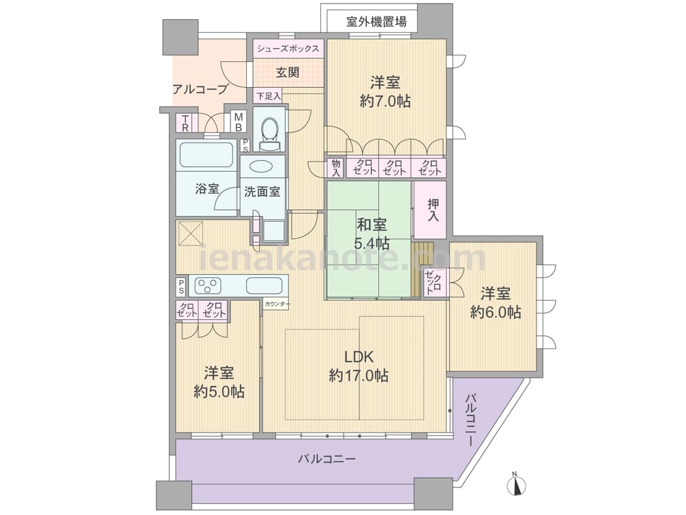専有面積87.13平米の4LDK。玄関先から室内が見通せない、プライバシー重視のプラン。玄関前のトランクルームはゴルフバッグや工具・ガーデニンググッズなど外で使う物を収納するのにぴったりです。LDK約17.0帖にはコーナーサッシが用いられ、隣接する居室の引き戸を開放すれば空間をより広々と使う事が可能。キッチンシンク前にカウンター付き。収納も各所に設けられています。浴室の窓は換気がしやすく快適。バルコニーは約18.88平米とゆとりがあります。
