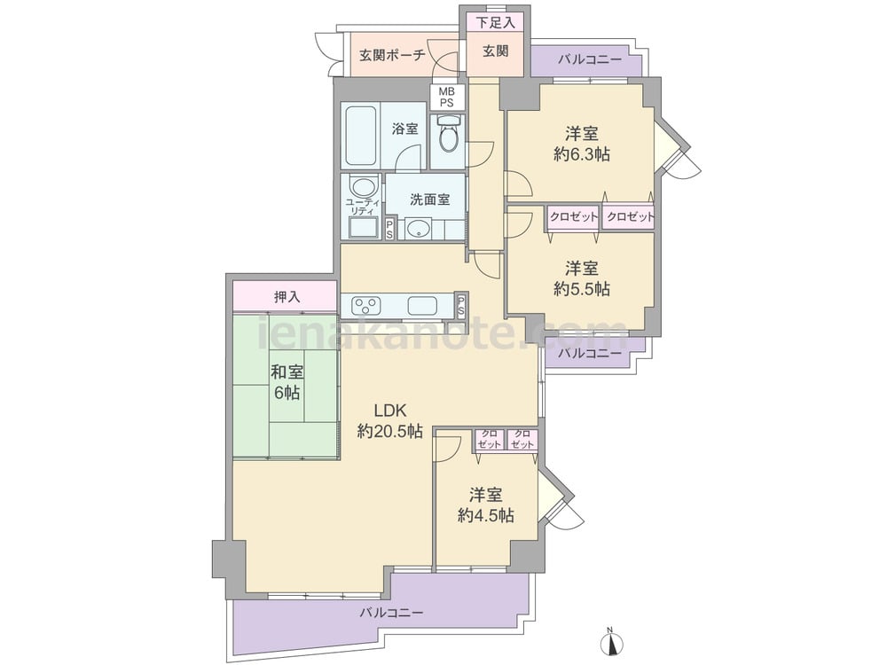 専有面積110.35平米の4LDK。玄関前に専用ポーチがあり、居室の窓が共用廊下に直接面してない、プライバシー性の高いプラン。LDKは約20.5帖大の広さがあり、和室の引き戸を開放すれば、LDKをより広々と使う事が出来ます。キッチンは対面カウンター仕様。洋室約4.5帖へはLDKを通って出入りするため、子供部屋にすればコミュニケーションの機会が増えます。各居室に収納付き。バルコニーは全部で3カ所あります。