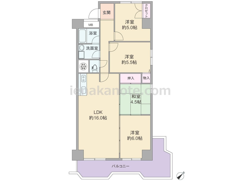 専有面積82.68平米の4LDK。玄関先から室内を見通せない、プライバシーが確保されたプラン。LDK約16.0帖、和室4.5帖、洋室約6.0帖が続き間で、それぞれ個室にしたり、引き戸を開放して空間を広げたりと、生活シーンに合わせてフレキシブルに使用出来ます。洋室約6.0帖にはクロゼットがありませんが、その他の居室に収納スペース付き。バルコニーは約14.8平米とゆとりがあります。