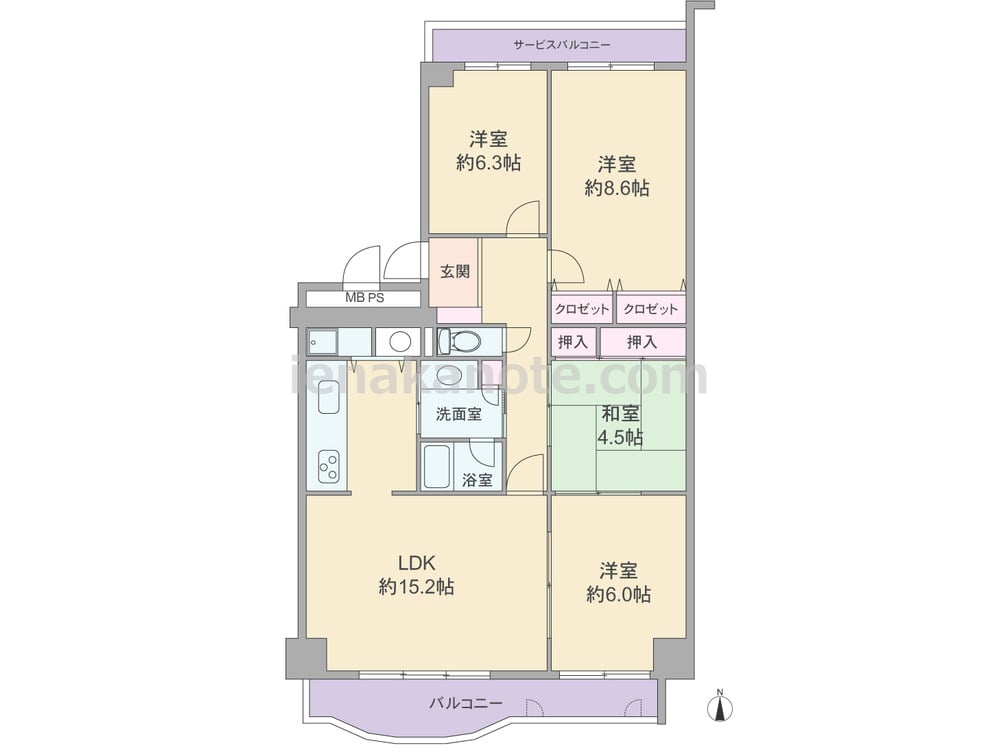 専有面積91.96平米の4LDK。二面バルコニーのプラン。独立型のキッチンは洗面室へアクセスでき、キッチン横に洗濯機置場があります。LDK約15.2帖と洋室約6.0帖、和室4.5帖は続き間で、それぞれ個室にしたり、引き戸を開放して空間を広げたりと自由にプラン変更が可能。洋室約6.0帖と洋室約6.3帖にはクロゼットが無いため、収納家具を置くなどの工夫が必要です。