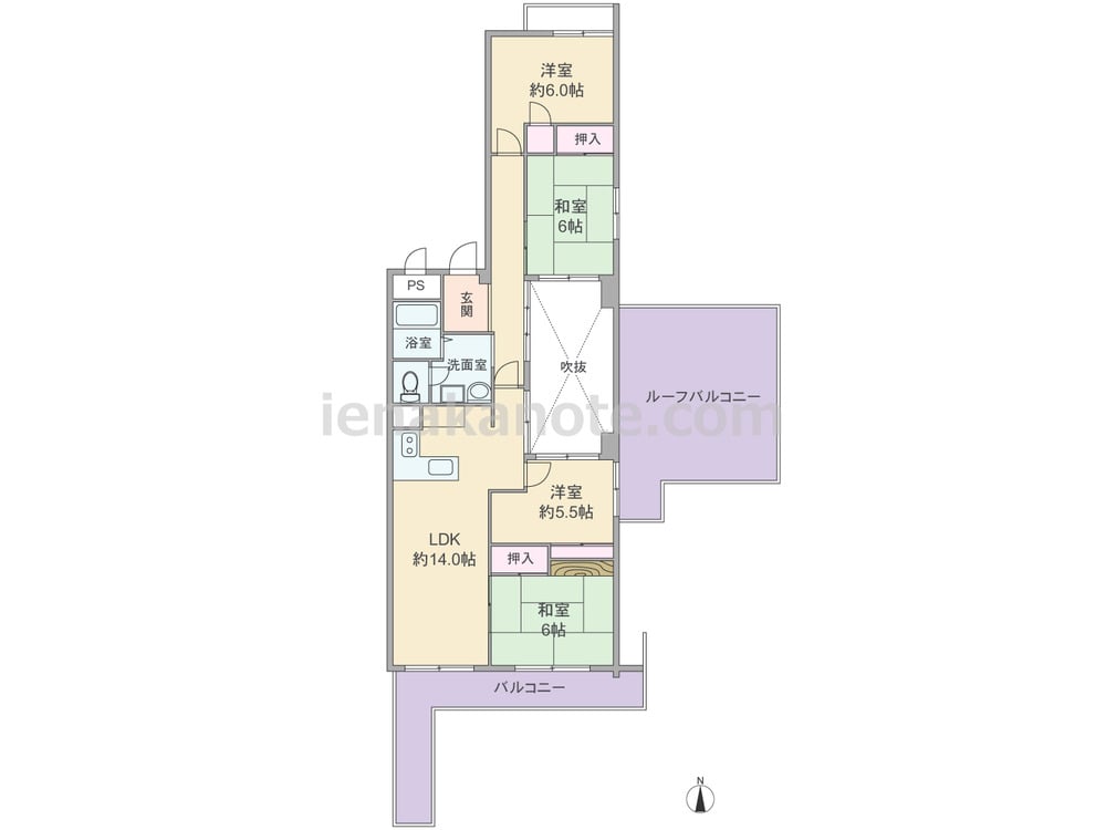 専有面積89.67平米の4LDK。吹抜やルーフバルコニーがあるプラン。玄関先から室内を見通せない、プライバシーを保ちやすい造りです。LDKは約14.0帖、キッチンはL字型の対面タイプ。LDKに隣接する和室の引き戸を開放すれば約20.0帖の空間に利用でき、洋室約5.0帖を子供部屋にすればコミュニケーションの機会が増え安心です。室内廊下も吹抜に面して窓があるため、室内に光や風を取り込む事が可能。バルコニーは約14.7平米、ルーフバルコニーは約48.95平米の広さがあります。
