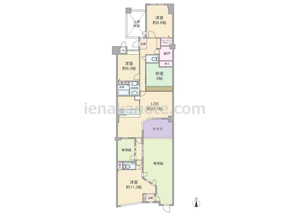 専有面積125.81平米の4LDK。全部屋6帖以上のゆとりが確保され、専用庭も付いたプラン。玄関・トイレは2カ所あり。LDKは約20.1帖、キッチンは対面カウンタータイプの仕様。和室6帖は板間があります。ウォークインクロゼットや大容量の納戸があるのもポイント。専用庭は約37.30平米の広さ。専用庭に囲まれた離れの様な約11.3帖の洋室があります。