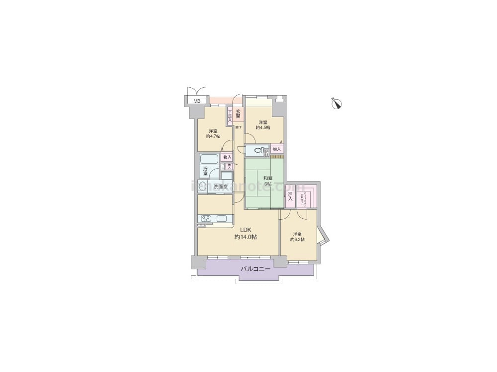 専有面積77.77平米の4LDK。キッチンはカウンタータイプで、家事効率の良い2WAY動線。LDKは16帖大。ワイドスパンのプランで、LDKと洋室6帖がバルコニーに面しています。各室に収納があり、ウォークインクロゼットもあるなど収納スペースが充実しています。