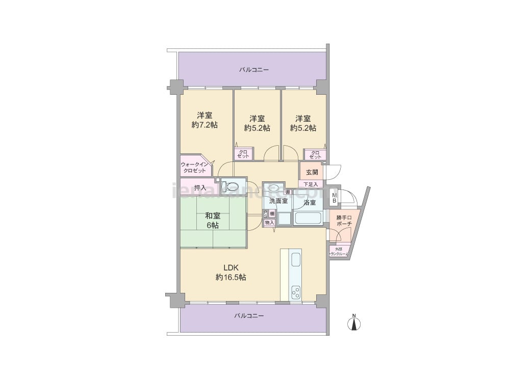 専有面積87.53平米の4LDK。南北両面にバルコニーがある、通風・採光にすぐれたプラン。LDK約16.0帖は南側に面し、対面カウンタータイプのキッチンは作業中もリビング全体を見渡す事が出来ます。また勝手口があるのも特徴。和室6帖はLDK側の襖を開放して続き間にしたり、来客時には室内廊下から出入りする客間にするなどフレキシブルに使える一室。収納スペースが各所にあり、主寝室約7.2帖にはウォークインクロゼットが設けられています。バルコニーは約17.72平米と広く、テーブルセットを置いてアウトドアリビングにしたり、ガーデニングを楽しむのにぴったりです。