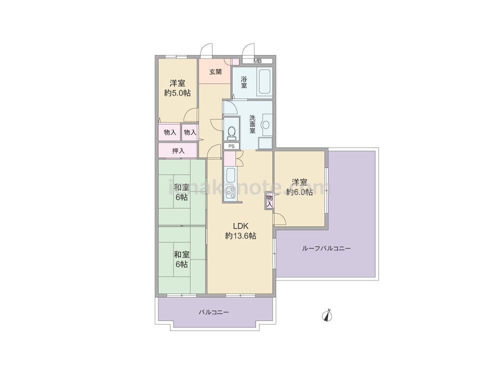 専有面積79.99平米の4LDK。洋室約5.0帖以外はLDKを通って行き来します。LDKは約13.6帖、キッチンはリビング・ダイニングから奥まって配置され、キッチン横から洗面室へアクセス出来ます。和室は続き間になっており、引き戸を開放すれば12帖大の空間にする事が可能。洋室約6.0帖を子供部屋にすれば、顔を合わせる機会が増え安心です。バルコニーは約8.23平米、ルーフバルコニーは約20.28平米の広さがあり、ガーデニングや家庭菜園を楽しんだり、テーブルセットを置けばアウトドアリビングとして空間を楽しむ事が出来ます。