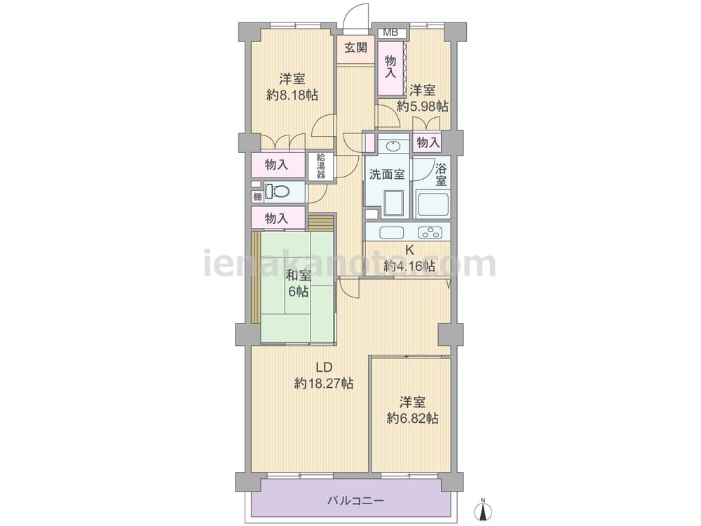 専有面積110.44平米の4LDK。生活感の出やすいキッチンは奥まって配置されているため、リビング・ダイニングはくつろぎの空間を保つ事が出来ます。洋室約6.82帖には収納がありませんが、その他の居室に収納スペース付き。和室の板間は家具を置くのに便利です。バルコニーは約10.2平米あります。