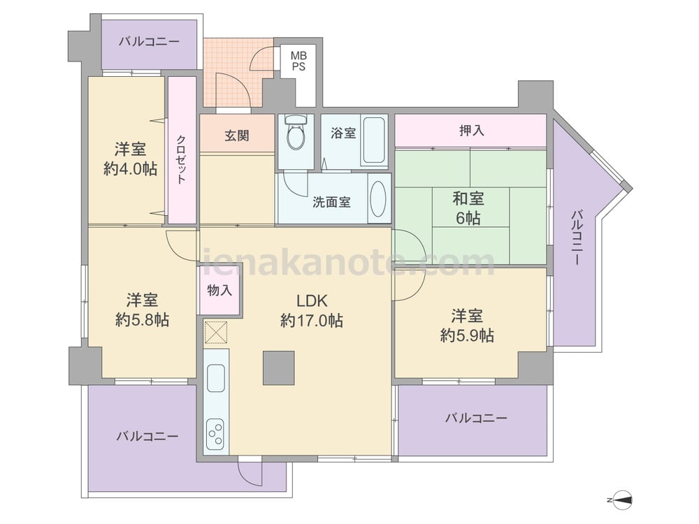 専有面積80.18平米の4LDK。全部屋バルコニーに面するプラン。共用廊下に直接面する窓が無いためプライバシーを保ちやすい造りです。どの部屋もLDK約17.0帖を通ってアクセスし、キッチン横にはバルコニーへの勝手口付き。洋室約4.0帖と洋室約5.8帖の引き戸を開放すれば約9.8帖の一室にプラン変更が可能。バルコニーは合計約24.70平米の広さがあります。