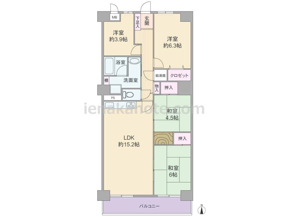 専有面積83.84平米の4LDK。LDK約15.2帖と和室4.5帖、和室6帖が続き間になったプラン。キッチンは空間を有効利用できるI型のウォールタイプです。和室4.5帖には窓がありませんが、押入+床間が設けられています。洋室約3.9帖にはクロゼットが無いため、場合により家具の配置が必要です。室内廊下に物入、洗面室には棚が付いています。