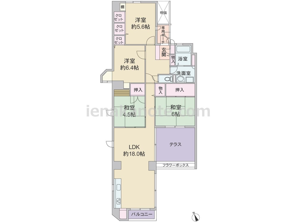 専有面積93.66平米の4LDK。玄関前に専用ポーチがあり、玄関先から室内を見通せない、プライバシー性の高いプラン。二面採光のLDKは約18.0帖とゆとりがあり、和室4.5帖の引き戸を開放すれば、約22.5帖大の一つの空間としても利用可能。キッチン前に小窓、キッチン横に収納が設けられています。浴室の窓は換気がしやすく快適。テラスは出幅があり、アウトドアリビングやガーデニングスペースにもピッタリです。