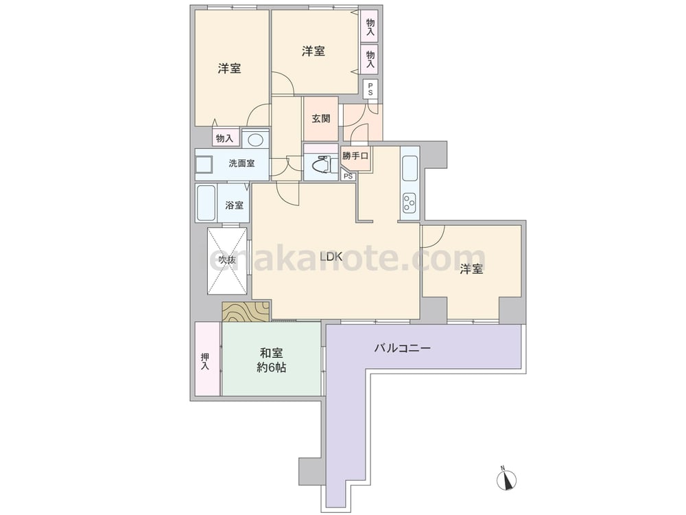 専有面積97.22平米の4LDK。3室がバルコニーに面するワイドスパンのプラン。LDKと浴室は吹抜に面して窓があり、独立型のキッチンには勝手口が付いています。和室6帖は個室や客間、リビングスペースなど色々な使い方が可能。LDK横の洋室を子供部屋にすれば、自然にコミュニケーションの機会を持つことが出来ます。広いL字型バルコニーは、ガーデニングや家庭菜園を楽しむのにぴったりです。