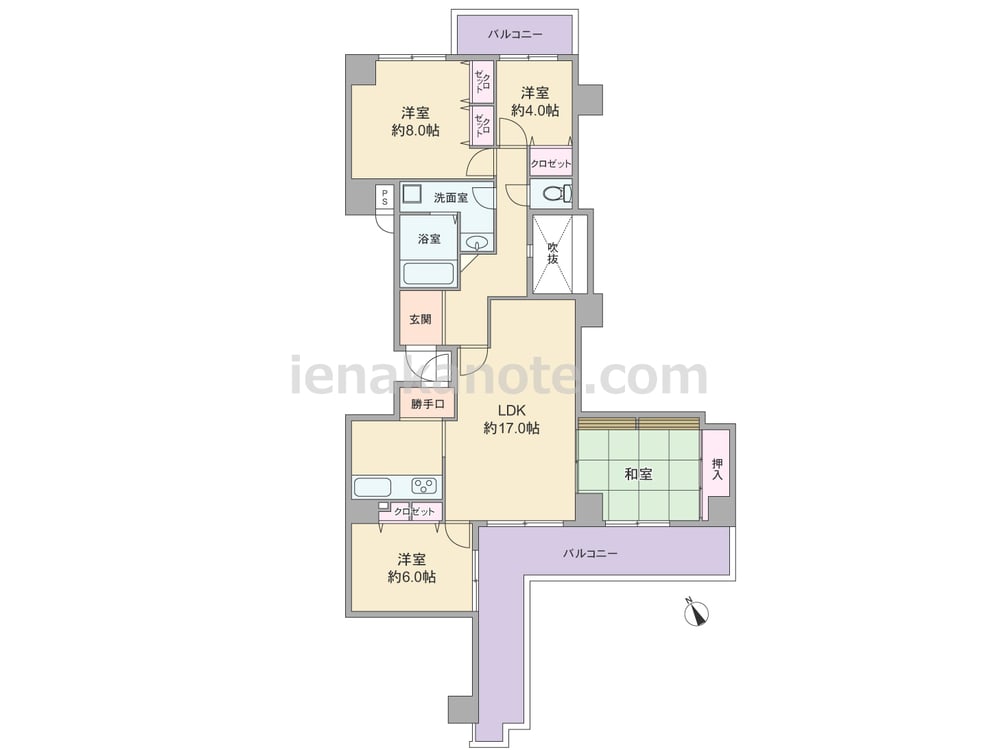 専有面積97.22平米の4LDK。玄関先から室内が見通せない、プライバシーを保ちやすいプラン。玄関ホールは吹抜に面して窓があり、飾り棚があるのもポイント。LDK約17.0帖と和室は続き間になっており、引き戸を開放すれば、リビング・ダイニングをより広々と使う事が出来ます。キッチンはリビング・ダイニングへ生活感が伝わりにくい独立型。勝手口から外へ出る事が出来ます。バルコニーが2カ所あり、ガーデニングを楽しむのによさそうです。
