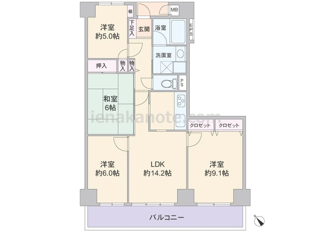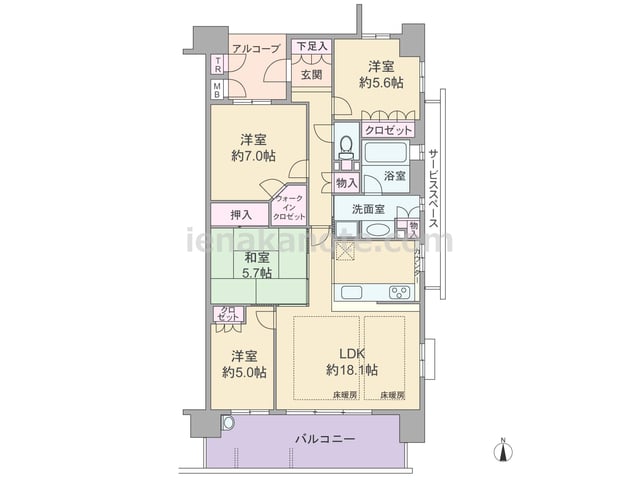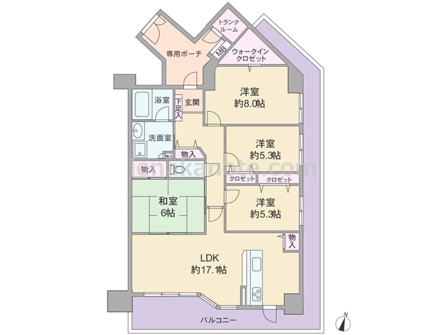 専有面積94.3平米の4LDK。玄関前に専用ポーチがあり、ポーチ内にトランクルーム付き。居室の窓が共用廊下に面していおらず、玄関先から室内を直接見通せない造りでプライバシーを保ちやすいプランです。キッチンは対面カウンタータイプ。キッチン横...