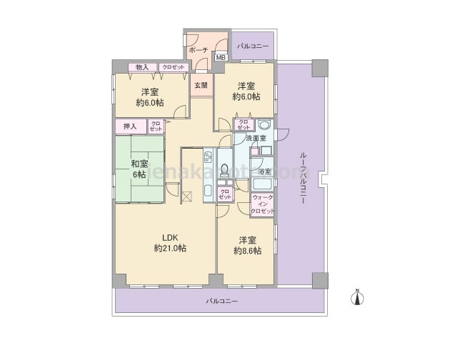 専有面積109.51平米の4LDK。玄関前に専用ポーチがあり、居室の窓が共用廊下に直接面していない、プライバシー性の高いプラン。全室6帖以上の広さがあり、LDKは広々約21.0帖大。和室6帖は個室や客間、襖を開放してLDK約27.0帖大に...