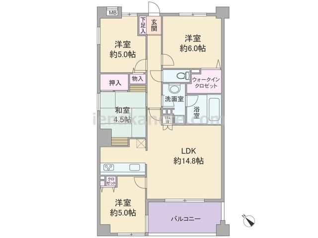 専有面積78.08平米の4LDK。LDK約14.8帖にはTEL台があり、独立型のキッチンはリビング・ダイニングに生活感が伝わりにくいのが特徴。南側洋室約5.0帖はLDKを通って出入りするため、子供部屋にすれば家族のコミュニケーションの機会...