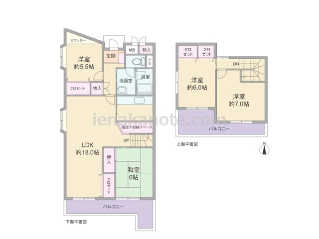 専有面積94.87平米の4LDK、メゾネットタイプ。LDKは約18.0帖の広さがあり、独立型のキッチンはリビング・ダイニングに生活感が伝わりにくいのが特徴。主寝室約7.0帖にはクロゼットがありませんが、その他の居室とLDK、玄関ホール、共...