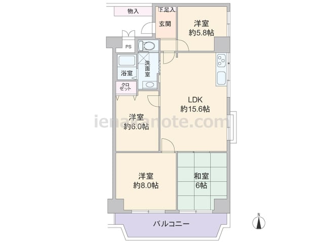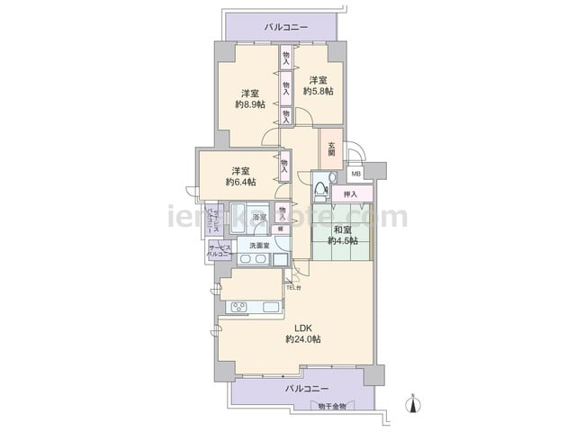 専有面積93.78平米の4LDK。共用廊下に面する窓が無く、玄関前にアルコーブがあるプライバシー性の高いプラン。玄関先から室内を直接見通せないのもポイントです。LDKは約19.3帖のゆとりがあり、和室の引き戸を開放すれば約23.9帖大の空...