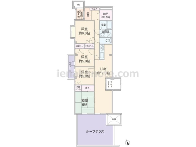 専有面積101.21平米の4LDK。玄関前にポーチがあり、プライバシーに配慮されたプラン。南側の広々としたルーフテラスはガーデニングスペースやアウトドアリビングとして使えます。LDKは18.6帖、キッチンは独立タイプ。リビングにはライトコ...