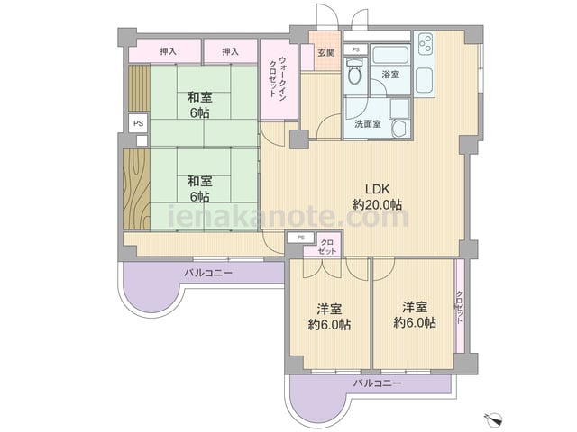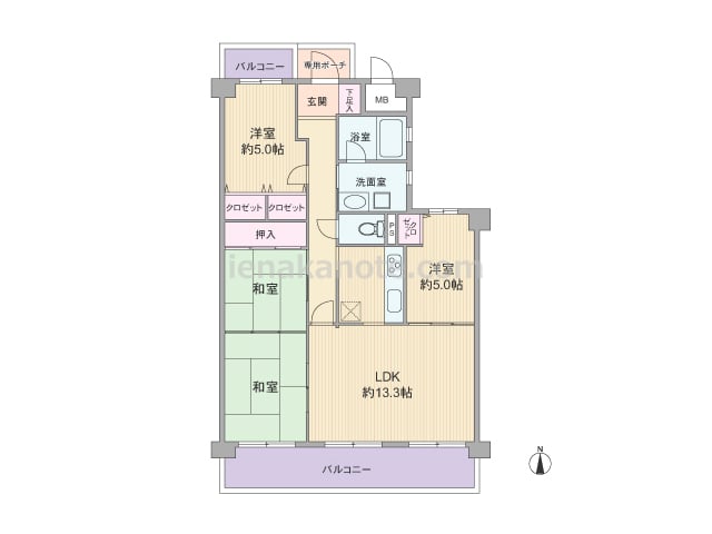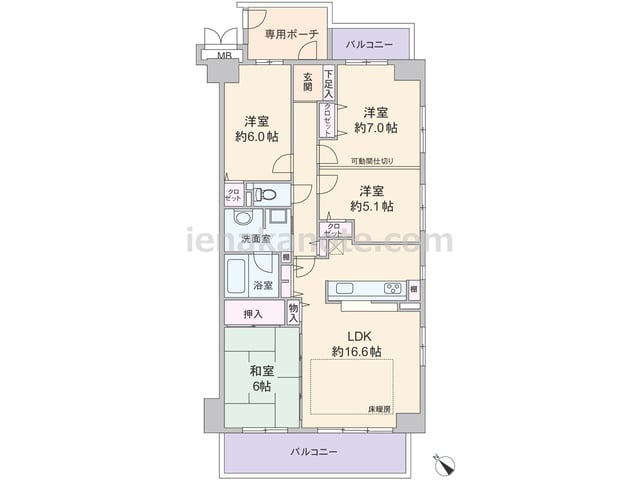 専有面積86.94平米の4LDK。玄関前にはポーチ付き。南西・北東両面にバルコニーがあります。キッチンはカウンタータイプ。LDKには和室6帖が隣接しており、襖を開放すれば、約22.6帖の空間としても使えます。各部屋に収納が確保され、リビン...