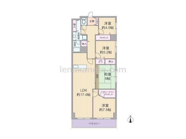 専有面積99.45平米の4LDK。LDK約17.4帖には和室6帖と主寝室約7.5帖が隣接しています。キッチンはリビング全体を見渡せる対面カウンタータイプ。各居室に収納スペースがあり、室内廊下や洗面室にも物入付き。バルコニーは約11.7平米...