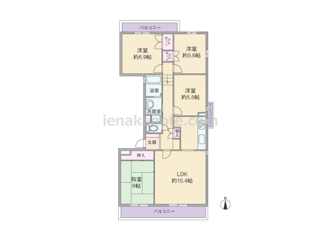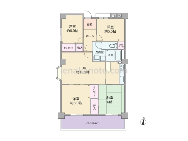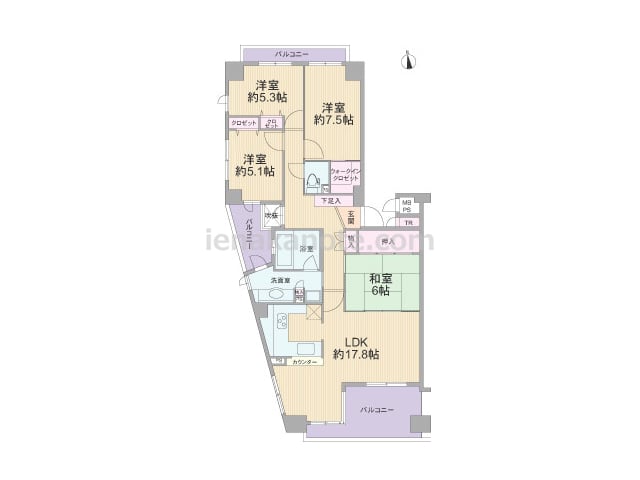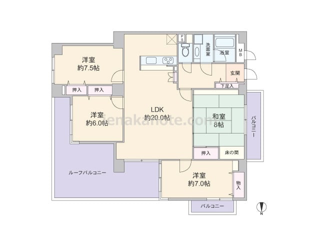 専有面積80.18平米の4LDK。全部屋にバルコニー・テラスが付いた風通しの良いプラン。LDK約16.6帖はコーナーサッシが用いれ、キッチン横にはテラスへの勝手口があります。収納は和室6帖と西側洋室約5.8帖にあり、その他の居室は家具の配...