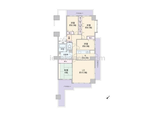 専有面積104.95平米の4LDK。共用廊下に居室の窓が面していない、プライバシーを確保したプラン。生活感の出やすいキッチンは独立タイプで、キッチン横にはバルコニーへの勝手口があります。二面採光のリビングダイニングは約15.5帖大と広く、...