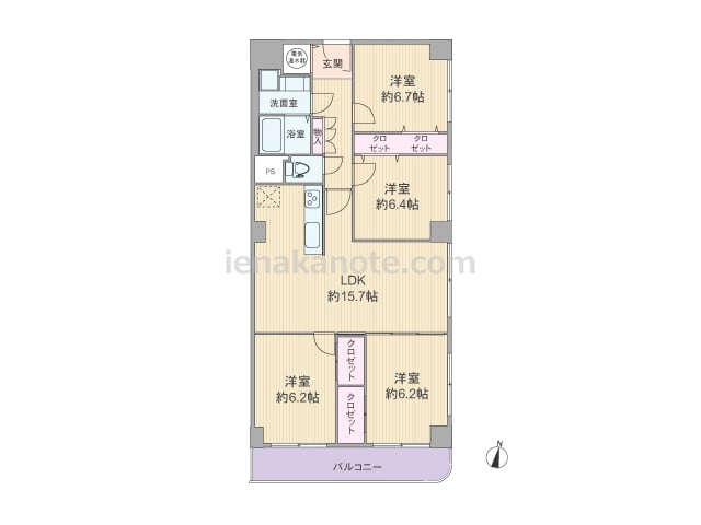 専有面積86.45平米の4LDK。玄関扉は内開きのため玄関スペースは限られますが、防犯面ではすぐれています。居室の窓が共用廊下に面していないのもポイントです。どの部屋も6帖以上のゆとりがある、センターリビングのプラン。LDKは約15.7帖...