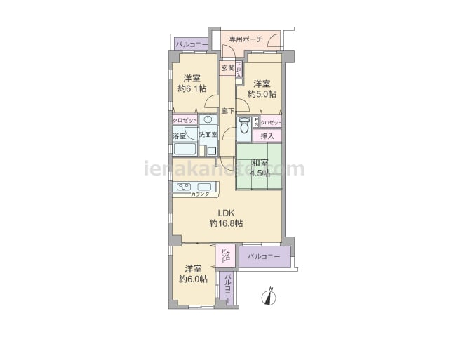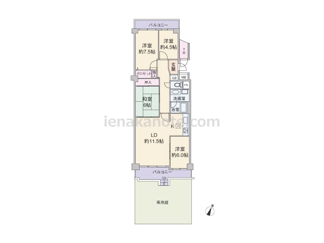 専有面積104.95平米の4LDK。共用廊下に居室の窓が面していない、プライバシーを確保したプラン。生活感の出やすいキッチンは独立タイプで、キッチン横にはバルコニーへの勝手口があります。二面採光のリビングダイニングは約15.5帖大と広く、...