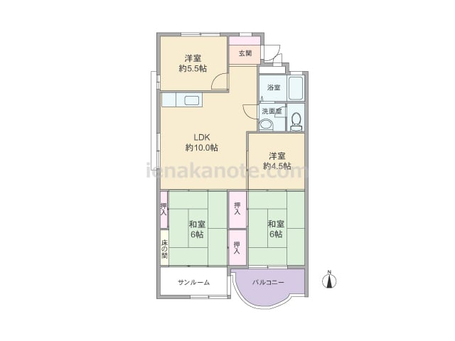 専有面積65.4平米の4DK。南向き・ワイドスパンのプラン。南北両面に窓があり、風通しのよい造りです。どの部屋も続き間になっており、引き戸を開放すれば空間を広々と使う事が出来ます。洋室約6.0帖には収納がありませんが、その他の居室と玄関ホ...