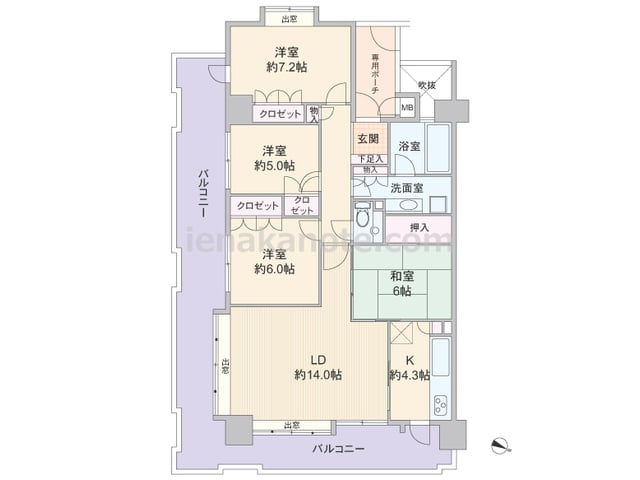 専有面積94.86平米の4LDK。LDKを含む4部屋がバルコニーに面しており、玄関前には専用ポーチが付いています。二面採光のリビング・ダイニングは約14.0帖あり、和室の引き戸を開放すれば約20.0帖大の空間に。キッチン約4.3帖は生活感...