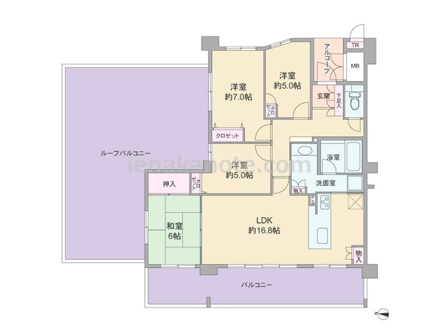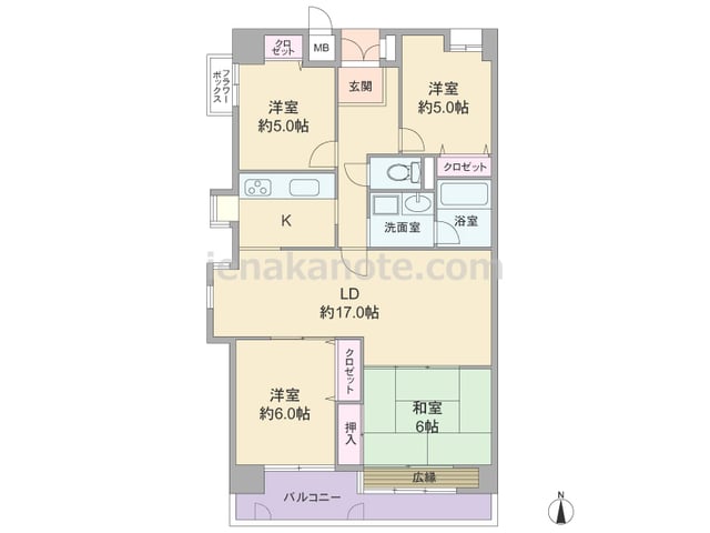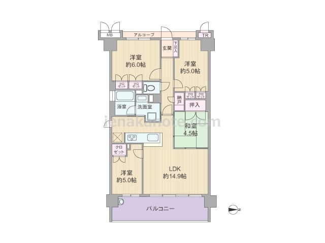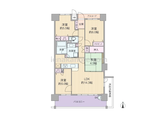 専有面積91.00平米(トランクルーム面積0.50平米含む)の4LDK。玄関前にアルコーブ、トランクルームがあります。LDKを含む4部屋がバルコニーに面する明るく・風通しの良いプラン。LDK約16.8帖に隣接する和室の引き戸を開放すれば、...