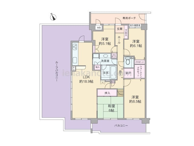 専有面積104.31平米の4LDK。玄関前に専用ポーチがあり、居室の窓が共用廊下に面していない、プライバシー性の高いプラン。LDK約18.9帖はルーフバルコニーに面しているため開放感があります。キッチンは洗面室にもアクセスでき家事動線の良...