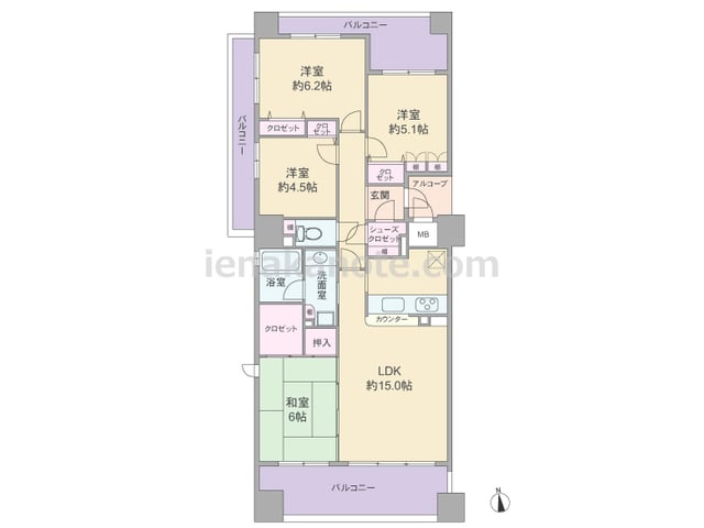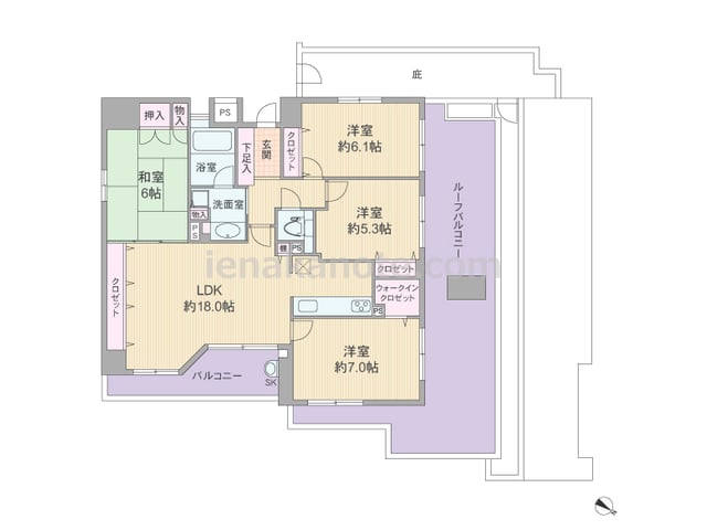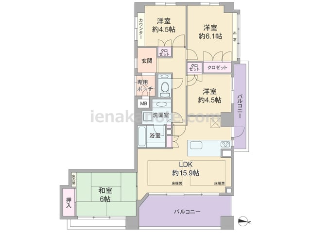 専有面積90.12平米の4LDK。LDKと洋室3部屋がバルコニーに面するワイドスパンのプラン。LDK約18.0帖には和室6帖が隣接しており、引き戸を開放すれば約24.0帖大の空間にする事が出来ます。生活感の出やすいキッチンは独立型。収納が...