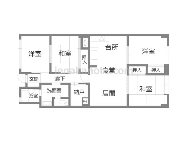 専有面積82.15平米の4LDK。共用廊下に面する居室の窓が無く、玄関先から室内を直接見通せない、プライバシー重視のプラン。LDKは約15.0帖、キッチンは対面カウンター式で、キッチン横に洗面室がある家事効率のよい造り。LDKと続き間の和...