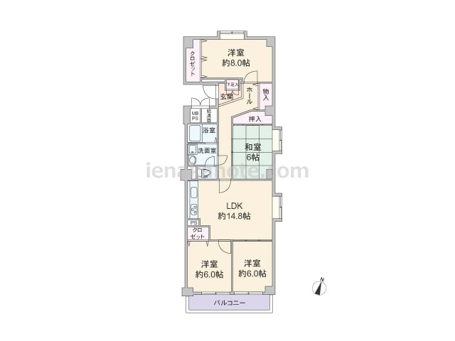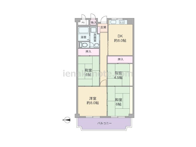 専有面積78.18平米の4DK。DKは約8.0帖、キッチンは壁付け・オープンタイプで、キッチン前に窓があります。DK以外は続き間になっており、バルコニーに面する洋室約8.0帖、和室6帖には収納スペースが無いため、家具を置くなど少し工夫が必...