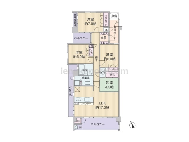 専有面積75.05平米の4LDK。ワイドスパン、両面バルコニーのプランで、キッチン以外の全居室がバルコニーに面しています。玄関先から室内を直接見通せない造りでプライバシーを確保。LDKは約12.3帖、独立型のキッチンは、リビング・ダイニン...