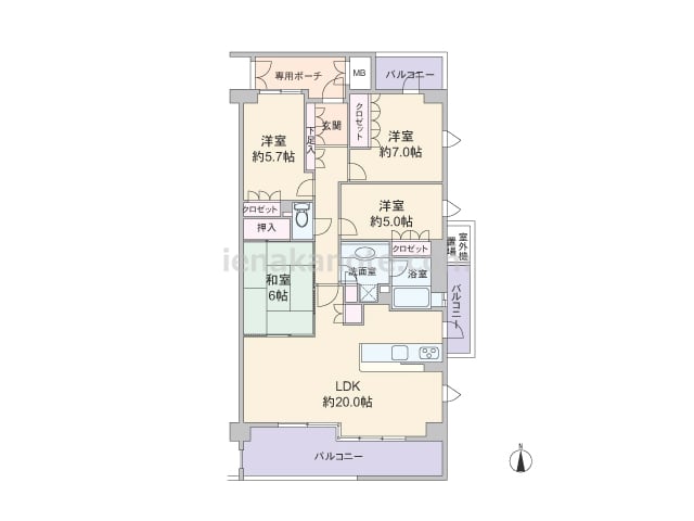 専有面積95.97平米の4LDK。玄関前に専用ポーチがあり、居室の窓が共用廊下に面していない、プライバシー重視のプラン。LDKは約20.0帖大と広く、和室の襖を開放すればより広々と空間を使う事が出来ます。明るく開放感のあるコーナーサッシが...