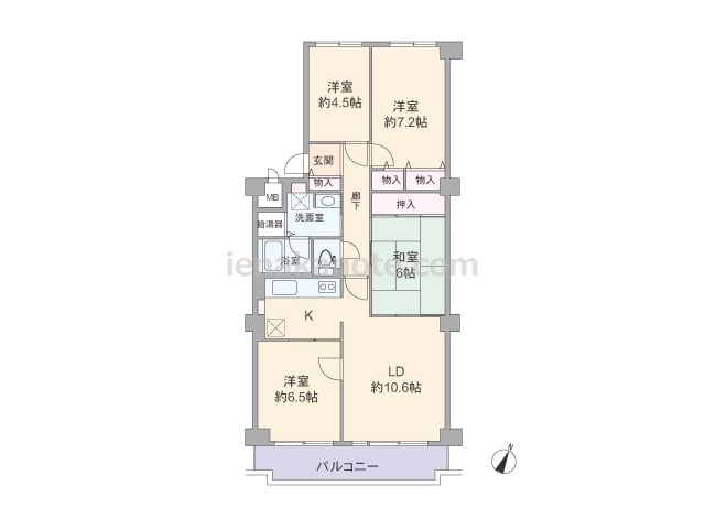 専有面積74.2平米の4LDK。居室の窓が共用廊下に面しておらず、玄関先から室内を直接見通せない、プライバシーに配慮されたプラン。LDKと洋室約3.9帖、和室4.5帖が続き間になっています。キッチンは料理中も家族と会話を楽しめる対面カウン...