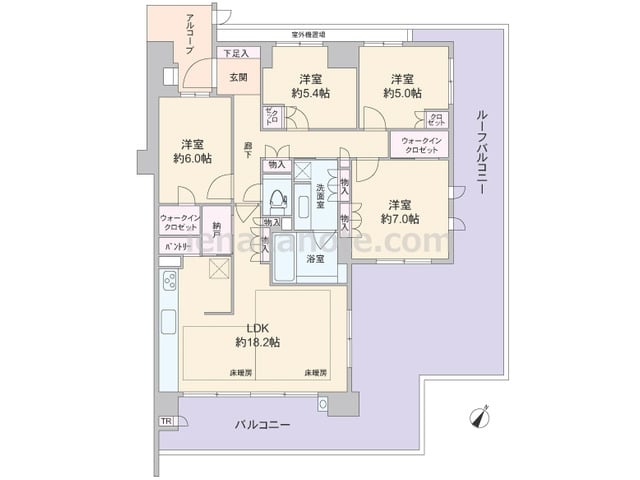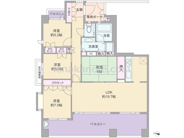 専有面積100.76平米の4LDK。玄関前に専用ポーチがあり、共用廊下に直接面する窓が無い、プライバシー重視のプラン。LDKは約19.7帖の広さがあり、独立型のキッチンはリビング・ダイニングへ生活感が出にくいのが特徴です。和室はLDKと室...